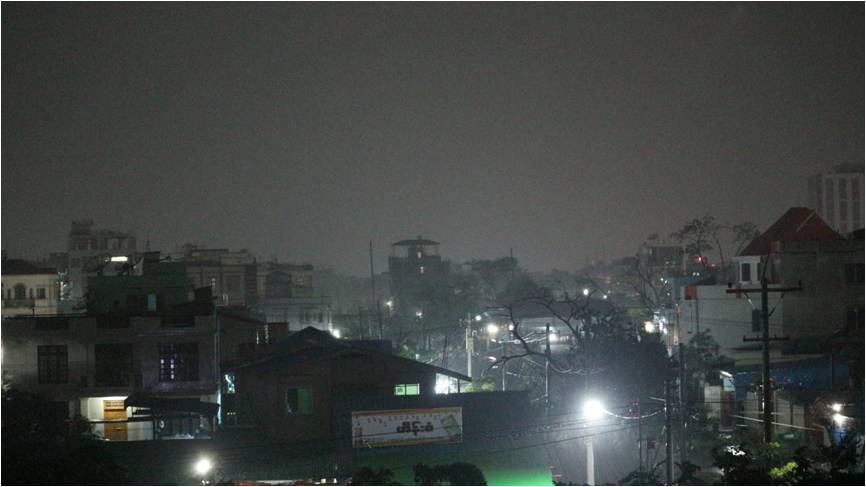 5日,曼德勒城迎来了连续酷热多天后的第一场大雨!在离学校很远的西南方向孕育了许久的大雨,做了浇遍全城之前的强有力蓄势。天空云层交错,升腾,聚集。远处电闪雷鸣,而撒到这里的只是星星点点,许多老师都在失望地说雷声大雨点小。约莫四十多分钟过后,一场大雨姗姗而来,又一次点燃了人们刚刚失望的激情!你看!你听!夹杂着时断时续的闪电和雷声,裹挟着伊洛瓦底江浓浓的江风,在城市浅黄色的灯光映照下,大雨排兵布阵一般的有远而至,大雨来啦!大雨来啦!雨柱光亮透明,给这座炙热的城市足足带来了近一个半小时的恩泽!校园的运动场及其周围一切,在四角屋檐昏黄的灯光抚摸下,雨水和灯光交融在一起,朦胧了眼前的一切……你看,雨柱溅到地上,地面升腾起了热气儿,缭绕了离地面两三米的空间。眺过城市的屋顶往外看,分不清哪里是雨,哪里是灯,哪里是云雾,一切都交融在一起了,组成了一幅别样的异域水墨画卷,塞满了人们的双眼儿,滋润了干燥的心田儿。此时我因为手机与网络的问题,去请教学校里从事餐厅工作的华裔老板,有幸和她的员工局促在一间60多平方米的屋里,享受着这场大雨带来的盛宴!