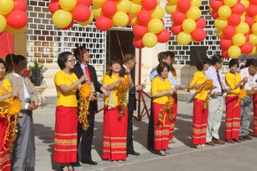 2013年11月9日早上我迫不及待地独自跑去学校,刚踏进校门,哇!给我大吃一惊!校园里那么多来自不同地区的贵宾,一大排的女老师穿着整齐的缅装,黄色衣和红色沙笼。手上拿着一大串红色和黄色的气球,随风飘扬,高高地飘着好看极了。因为我们的年龄最喜欢气球,所以我和同班同学一起跑去和老师们拍照。这镜头好帅呀!我们等待开幕剪彩仪式,这时我回头一望,啊!金黄色的太阳照耀着教学楼的福庆两个字,“福庆”也闪烁着辉煌的亮光,灿烂的阳光照射着每个学生的脸上,个个喜笑颜开。露出了可爱的笑脸,迎接着美好的时光。