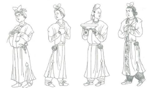 高髻、翻领小袖长衣侍女石刻线画(西安南里王村韦泂墓出土)(来源于沈从文《中国古代服饰研 初唐 胡妆究》)