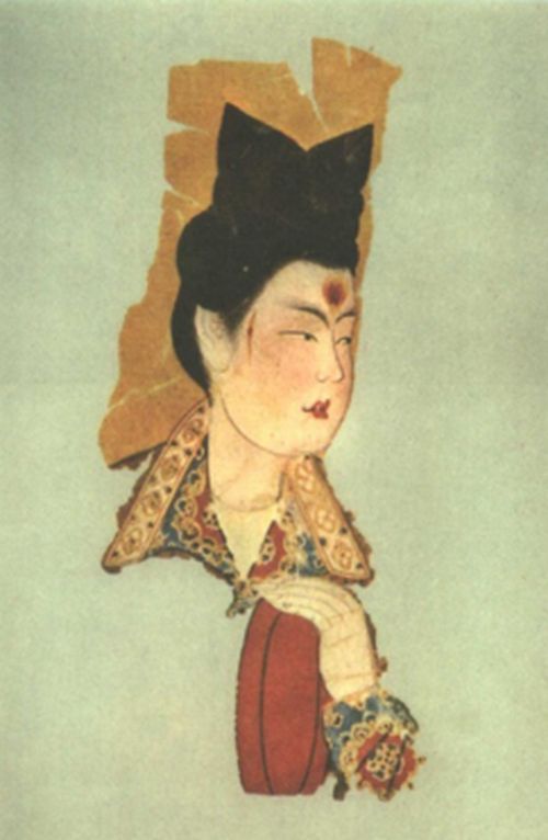 高髻、团花锦绣翻领小袖胡服妇女残绢画(新疆土峪沟出土)(来源于沈从文《中国古代服饰研究》)