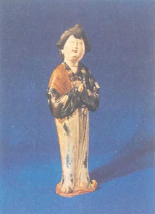 大髻、小袖衣、披帛、长裙妇女三彩陶俑(来源于陕西省博物馆) 天宝年间