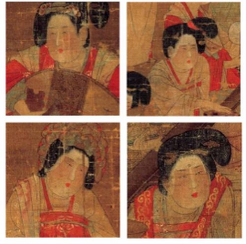 另外,面妆的修饰必然与服饰、头饰搭配相契合。因此,面妆修饰的发展变化必然与服饰、头饰的流变息息相关。经研究考证,笔者认为,唐初女性服饰受“武德令”影响,大致沿袭隋风,以端庄秀丽、修长婀娜为风尚,“尚危侧”,“笑宽缓”,流行紧身窄小的服装款式,好高腰、束胸、贴臀、宽摆齐地多褶斜裙。故,为贴合这种隽秀之美,女性在面妆修饰上也趋向清雅简约。到武周统治时期,服饰及头饰制作工艺更加成熟,装饰越发繁琐、精美,逐渐体现雍容华贵的气质,配色上也更加大胆,与此呼应,面妆由清雅向娇艳转变。唇妆作为面妆的点睛之笔,必然也符合这种审美趋势的转变。同时,笔者认为,这种“共变”的关系与中国传统审美意识密不可分。中国传统审美观念尤其注重和谐,力求头饰、服饰、面妆的和谐统一,以将古代女子娇柔优美、典雅大方之态衬托到极致。