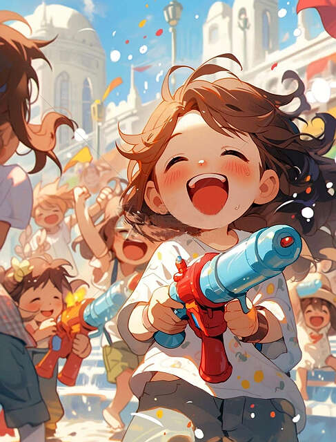 广场上,年轻人手持水枪、水桶,个个神采飞扬,跃跃欲试。突然,一盆清凉的水迎面泼来,水花四溅,瞬间驱散了炎热!我和妹妹欢呼雀跃,立刻抄起水枪,争先恐后地向人群泼去。广场上顿时沸腾起来,人们你追我赶,手舞足蹈,水花漫天飞舞,欢声笑语此起彼伏,汇成一片欢乐的海洋。