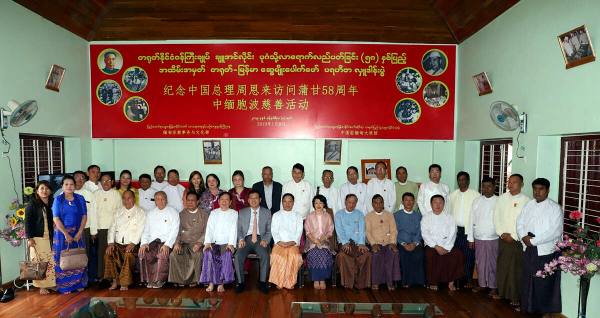 上午十时,中国驻缅甸大使馆在瑞喜宫金塔侧周恩来凉亭举行纪念周恩来总理访问蒲甘58周年慈善捐赠活动。洪亮大使、缅甸政府宗教和文化部长都拉吴昂哥、曼德勒省计划与财政部部长吴妙都、蒲甘良乌地区人民议会议员吴苏、蒲甘宗教与考古研究所局长吴敏伦、缅中友协会长吴盛温昂出席了捐赠仪式,缅华基金会董事长赖松生、副董事长陈民昆和常务理事们也出席了捐赠仪式。