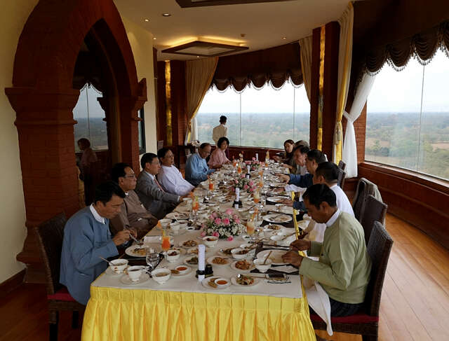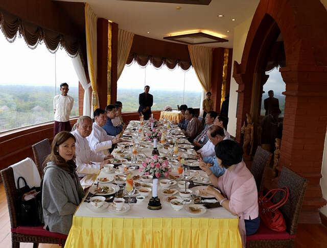 活动完满结束后,洪亮大使还特地在迪律毕诗雅五星级大酒店设午宴招待此次活动相关单位负责人,他们是:都拉吴昂哥部长、曼德勒省吴茗杜部长、蒲甘地区行政长官、缅中友协会长吴盛温昂、缅华基金会董事长赖松生、副董事长陈民昆、金固股份有限公司胡瑞星女士、瑞丹伦有限公司总裁吴觉温等。