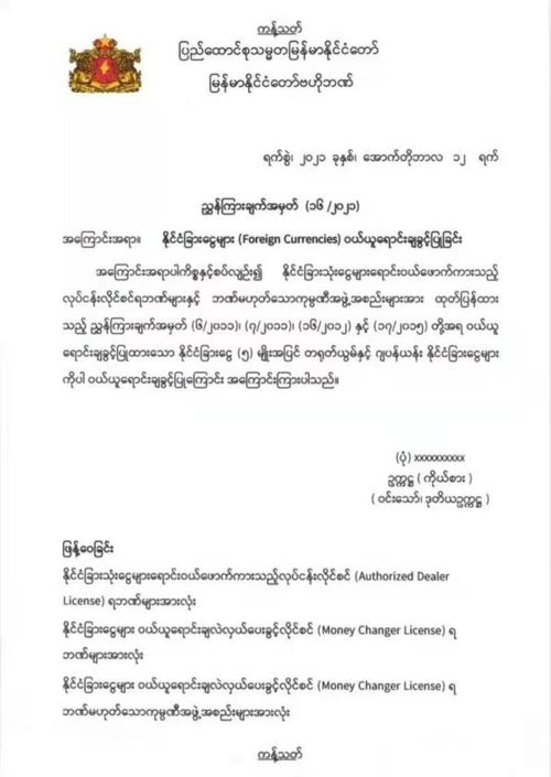 缅甸中央银行2021年10月12日发布公告称,此前根据 (6/2011)、(7/2011)、(16/2012)、(17/2015)号指示的五种外币以外,准许持有外汇交易牌照的银行及非银行货币兑换机构,即日起在缅甸国内可合法交易人民币和日元等外币。