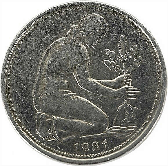 使用欧元之前,从1芬尼到1马 克的硬币上,都以橡树叶子作为装饰图案,50芬尼的硬币背面是一位健美的女性种植橡树树苗的画面。