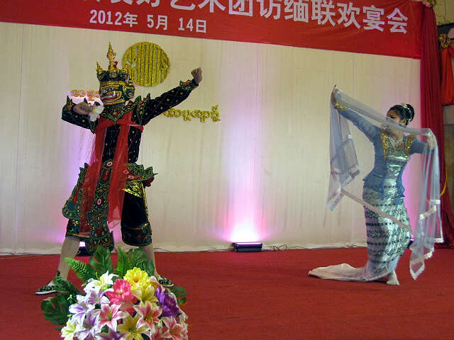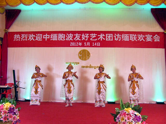 2012年5月14日下午7:00时,仰光各侨团及梅花皇宫大酒家董事们在梅花皇宫大酒家大厅举行欢迎宴会,宴请由中国侨联陈迈部长为团长的中缅胞波友好艺术代表团全体成员。除艺术代表团之外,还有中国企业家代表团以及“光明行”医疗队成员等共两百多人出席了宴会。