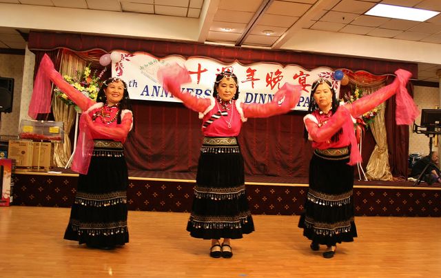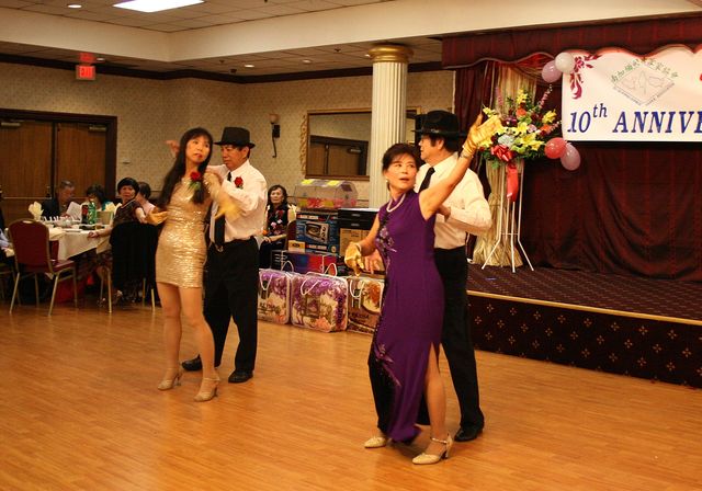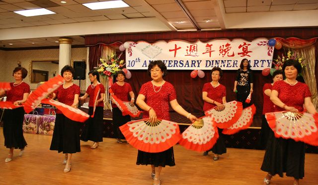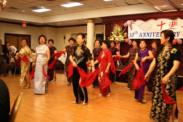 兩位領事還和六位客屬同鄉會的會長、我會現任會長楊群芳、首屆會長蔡玉贊和理事張少應一齊合唱 “ 龍的傳人”。他們的歌聲嘹亮激昂,振奮人心,來賓們報於熱烈的掌聲。在久久不能停息的掌聲要求下他們再唱一首 “我的中國心”。一個溫馨又激情的場面把熱愛祖藉國、熱愛家鄉的情怀展示無遺,立刻把晚會的氣氛推向高潮。今晚的宴會除了慶祝我會誕生十週年、中領館首次派領事蒞臨祝賀,還有美國多個客屬團體大團圓的三重意義,非常特殊。 所以楊群芳會長在致詞時除了表示感激兩位領事的支持和鼓勵外,對前來祝賀的各社團代表和助興團團員們也表示衷心的感謝。他十分自豪地說:在慶宴的籌備過程中,理事們展現出高度的團隊精神,為了辦好這個晚會,連曰來勞心又勞力,也犧牲了不少私人的寶貴時間。他誠懇地向這些理事和義工們鞠躬致敬。