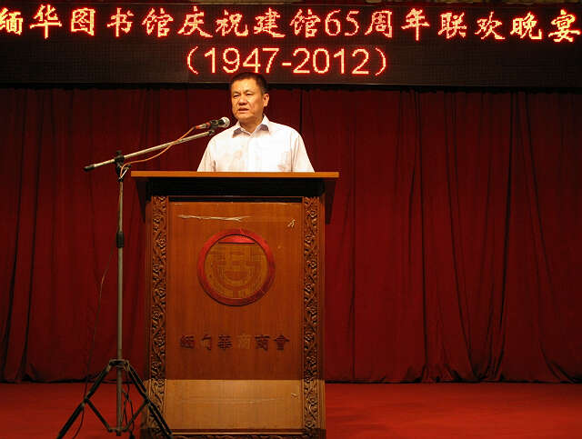 缅华图书馆于2012年6月23日下午6时假座缅甸华商商会礼堂举行建馆六十五周年联欢晚宴。来自缅华各侨团、各侨校代表、外派老师及缅华各界侨贤欢聚一堂,中国驻缅甸大使馆领事部张鹏秘书出席了宴会。首先,缅华图书馆主任黄庆燕先生致辞,他回顾了缅华图书馆建馆六十五年来的历程,缅怀先辈们在困难的条件下创建了缅华图书馆,至到今天,乃然深受人们敬佩。黄庆燕先生指出,缅华图书馆的成长和发展,是和全体缅华侨胞的热烈支持分不开的,同时,也得到中国驻缅甸使馆的支持和鼓励分不开。今日图书馆的面貌,已非昔日可比,目前藏书四万多册,还有保存古代汉语资料、四库全书3万8千册的光碟。