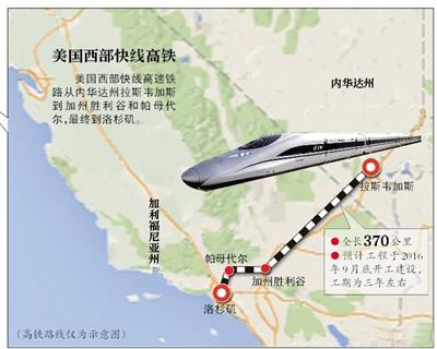 中国铁路总公司牵头的中方联合体与美国西部快线公司将合资建设美国西部快线高速铁路。该高铁从内华达州拉斯维加斯到加州胜利谷和帕母代尔,最终到洛杉矶,全长370公里。预计工程于2016年9月底开工。