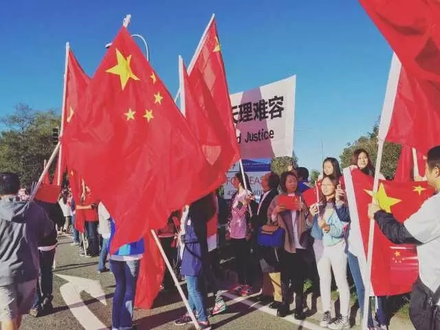 也有举白幅反华的,可惜不成气候,在一片一片的五星红旗里挣扎出头。有意思的是,虽然声音不同,双方各举各幅,你做你的宣讲,我唱我的歌,互不干涉,互不指责,一起等待习大大降落。
