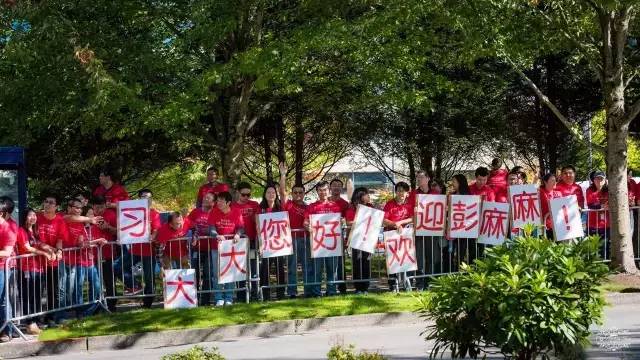 一个小时之后,习主席的车队离开微软,志愿者队伍整齐,热情不减,重新排好了标语,高喊“习大大再见”。海外华侨们心系祖国,在美国总部工作的微软华人员工们能够亲眼目睹习主席的到访,激动的心情溢于言表。