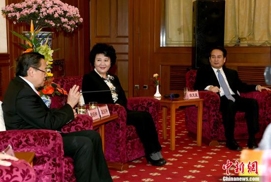 3月9日,中国国务院侨办主任裘援平、副主任谭天星在北京会见列席全国政协十二届四次会议的海外侨胞代表。 中新社记者 张勤 摄