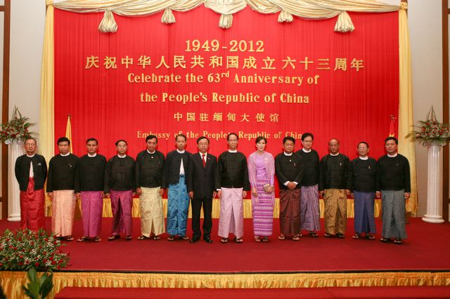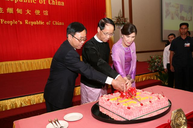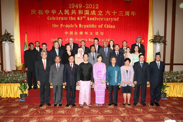 中华人民共和国驻缅甸联邦共和国特命全权大使李军华先生于2012年9月30日假座喜多那大酒家举行盛大招待会,热烈庆祝中华人民共和国成立63周年。缅甸联邦共和国副总统赛茂康暨夫人、人民议院副总统吴南达觉沙、建筑部部长吴觉伦、体育部部长吴定山、仰光省行政长官吴敏瑞以及仰光省各部部长、军方负责人、各国驻缅使节等应邀出席招待会。出席招待会的还有缅甸各界友好人士、缅甸华人华侨代表、中资机构代表,外派老师。