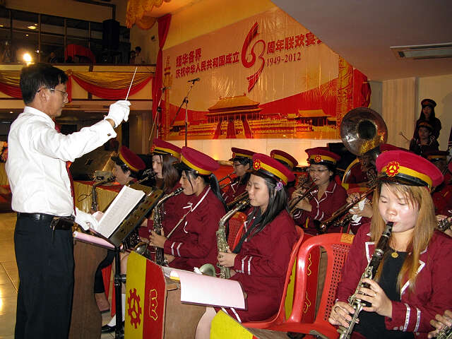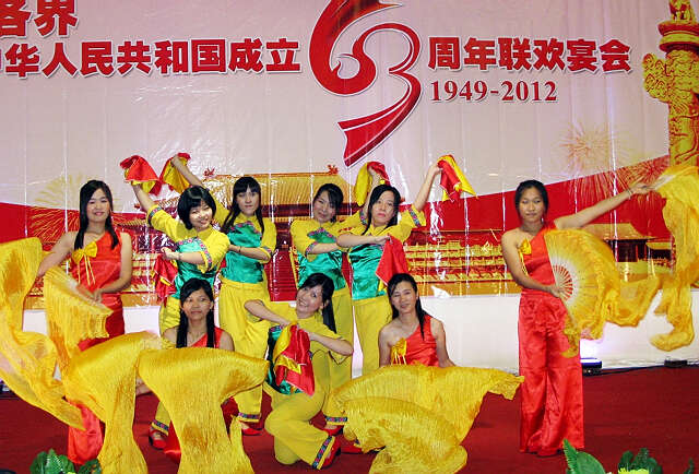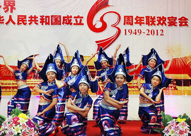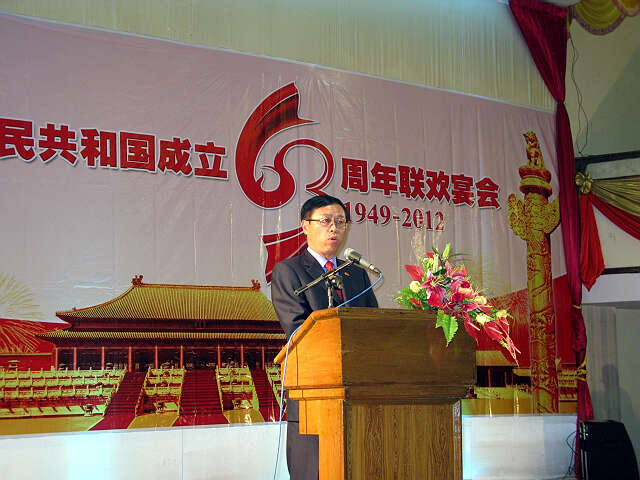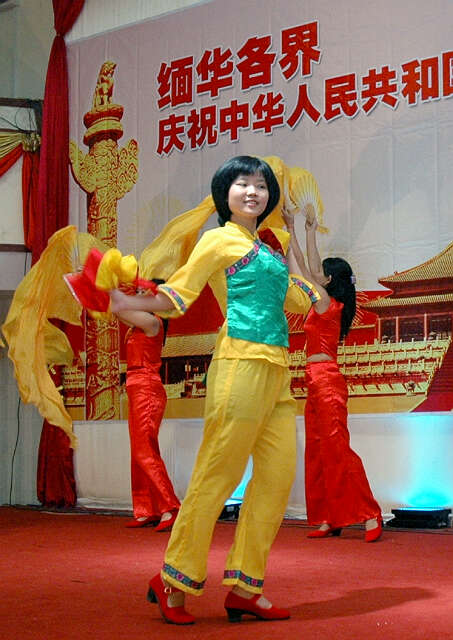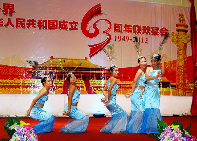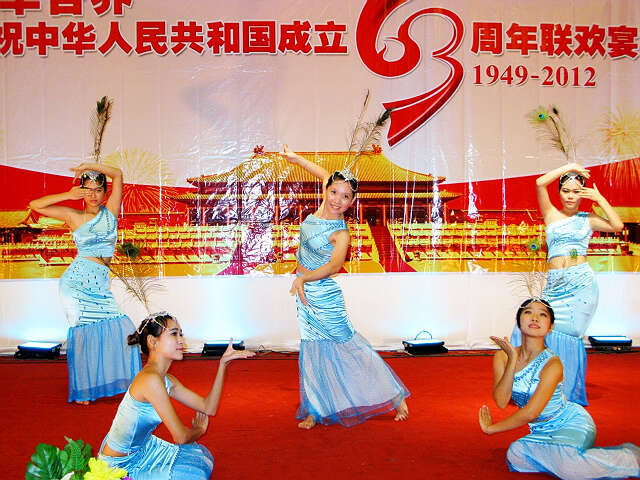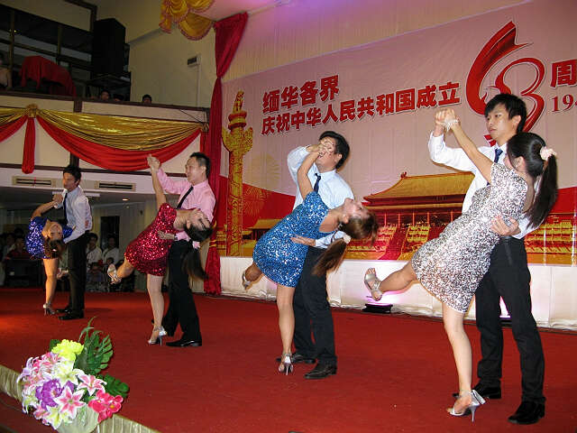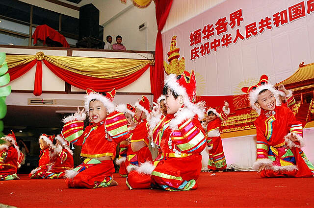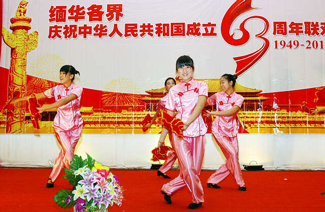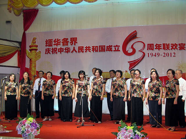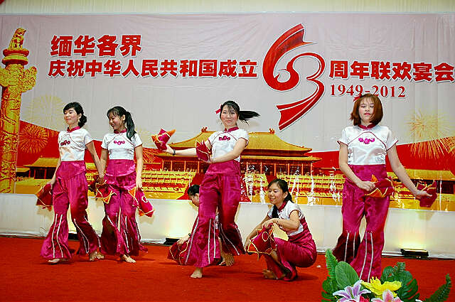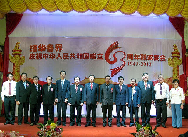 缅华各界于2012年10月1日下午六时假座梅花皇宫大酒家举行庆祝中华人民共和国成立63周年盛大联欢晚会。中华人民共和国驻缅甸联邦共和国特命全权大使李军华先生、政务参赞陆治先生、文化参赞高华先生、领事主任杨庆连先生、张鹏秘书、林建明秘书及使领馆馆员们出席了晚会,来自纳不打、毛淡棉等地的缅属代表们、缅华各界代表们、中资公司代表们、外派老师们共1300多人参加了联欢晚会。