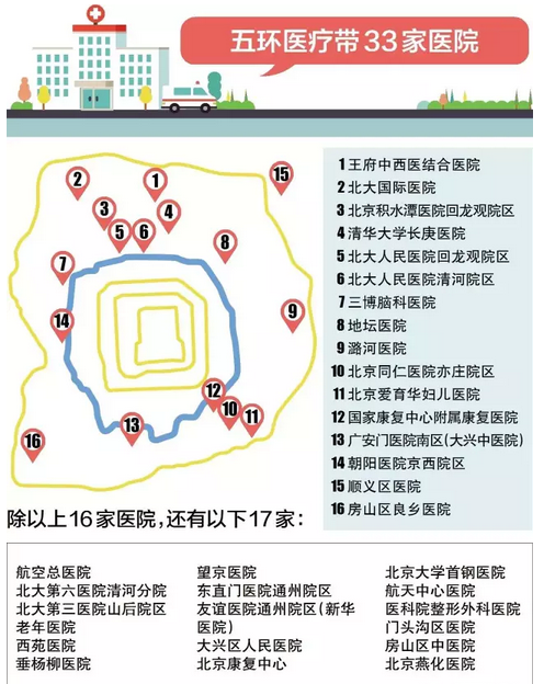 北京五环周边地区已初步实现了33家医院,还有不少大医院也陆续做好了走出五环的准备。天坛医院迁建丰台花乡、友谊医院顺义院区、安贞东坝国际医院(暂定名)、北大人民医院回龙观院区等十余家医院也正在建设或规划中。