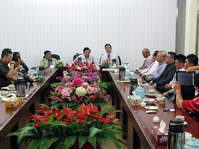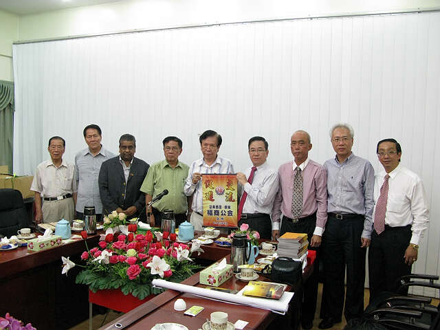 马来西亚槟城福商公会代表团一行22人在会长丹斯里拿督斯里陈坤海硕士率领下,于今天下午4:30时造访缅甸华商商会,受到赖松生会长暨副会长和理事们的热烈欢迎。宾主进行了亲切深入的交谈,并相互交换了纪念品,赖松生会长同时把前几天缅甸政府公布的"外国投资法条例"中文译文送给代表团,代表团成员表示非常兴趣。该中译文由缅华网翻译。