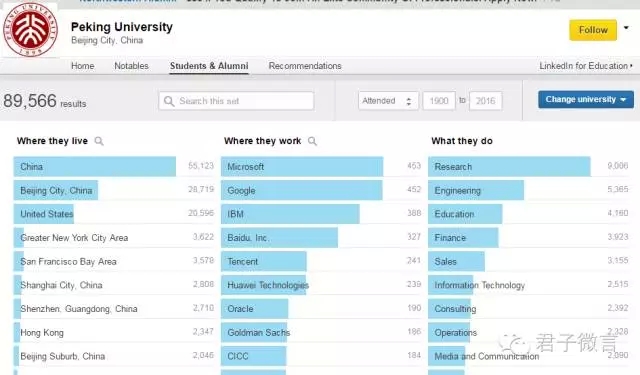 通过搜索领英上的中国大学,很容易得到在领英上注册的中国各大学毕业生的统计数据。如上图,每个学校都可以查到其毕业生“在哪里居住” (Where they live),“在哪里工作” (Where they work) 和“他们做什么” (What they do) 这三项数据。