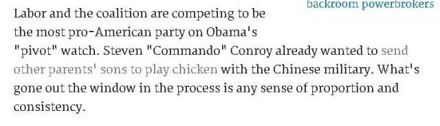可悲的是,Michael Pascoe先生认为如今澳大利亚政界的两大党,却似乎陷入了一种向美国“争宠”的尴尬局面,纷纷在刻意迎合奥巴马的“重返亚洲”战略。其中澳大利亚的国防部长,似乎是为了想在“山姆大叔”那里讨个“指挥官”的工作,居然还打算把澳大利亚父母的孩子们送到南海,跟着美国挑衅中国...