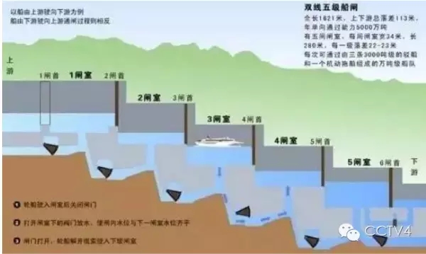上游是第一闸室,下游是第五闸室。假如船舶要从下游驶向上游——船舶驶入第五闸室后,关闭下游人字门,通过地下输水系统,第四闸室往第五闸室内充水,当两个闸室内水面齐平时,打开上游人字门,船舶驶入第四闸室。依此类推,船舶就好像爬过一级又一级楼梯一样,通过第一闸室,驶向大坝上游航道。船舶下行的过程相反。