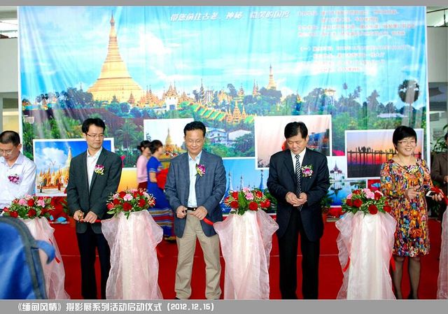 最后,由领导和赞助人曾羡珠共同剪彩,本次摄影展系列活动启动仪式顺利落幕。领导和宾客一起观看摄影展,缅甸的旖旎风光和民俗风情让他们赞不绝口,摄影作品的制作水平,也博得了广泛好评。