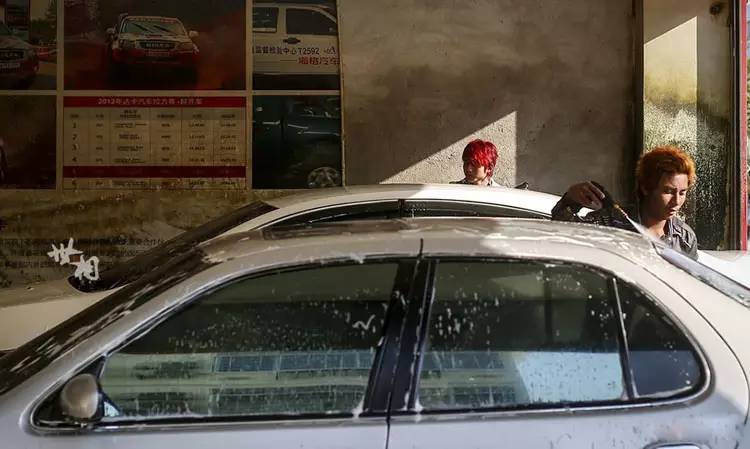 染着红色头发的缅甸人,在洗车行外晾晒毛巾。