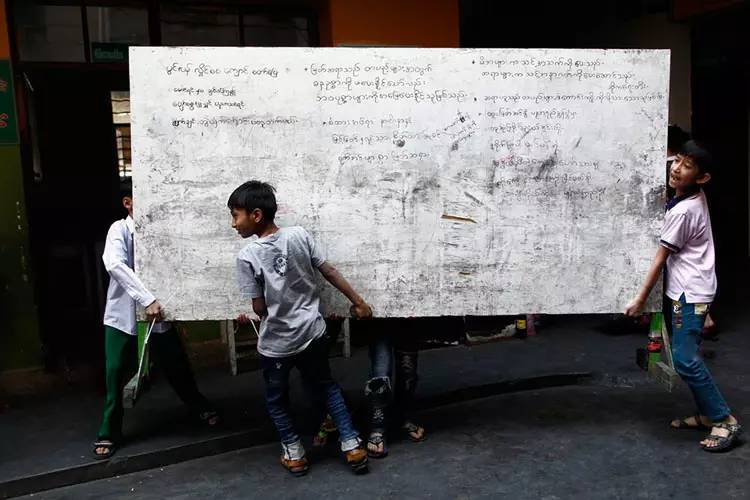 虽然在瑞丽经商务工的缅甸人只要拥有合法居留证件,都可以把孩子送到中国学校上学,但由于语言不通,许多孩子的学习进度都跟不上。为此,缅甸珠宝商人彭觉决定在瑞丽创办一所缅甸学校。图为在学习搬课板的缅甸学生。