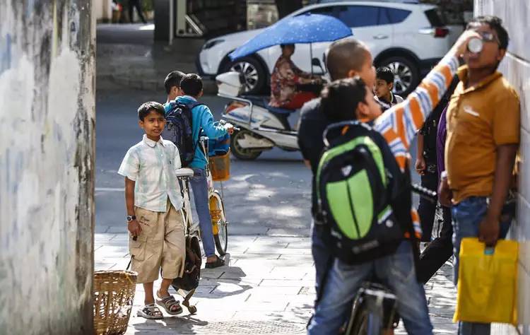 2006年,彭觉将该设想付诸实践。“起初就是为了方便在瑞丽的缅籍学龄孩子上学”,彭觉说,“但后来我们希望通过中缅文双语教学,让缅籍孩子了解中国文化,更好地融入当地生活,促进中缅文化交流”。图为在巷口的缅甸学生。