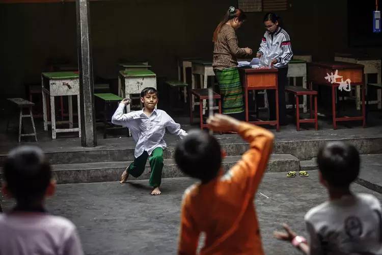 随着学校规模越来越大,越来越多瑞丽当地的孩子来到学校学习缅语。现在学校每天早上8点到下午5点是缅籍学生上课,开设中国语文、缅甸语文、数学、英语、音乐、美术、电脑等课程,教学阶段从学前班到9年级。下午5点以后则是中国学生学习缅语的时段。图为在学校内玩耍的缅甸学生。