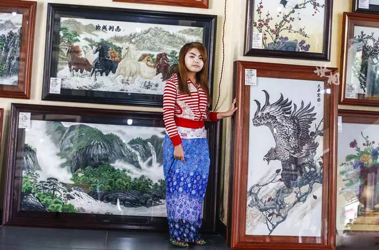18岁的阿莱和宝石画成品合影,这些都是缅甸宝石画以前没有的题材。三年前,缅甸华侨王茗专门从抹谷请来了一些年轻艺人,她们来到云南省瑞丽市创作“中国题材”的宝石画。28个20岁出头的姑娘都没有结婚,从曼德拉驱车15个小时左右来到瑞丽,一年到泼水节(缅甸新年)时才回家一次。她们不会说汉语,闲暇时会看有缅文字幕的韩剧,每周工作六天,用的都是缅甸时间。