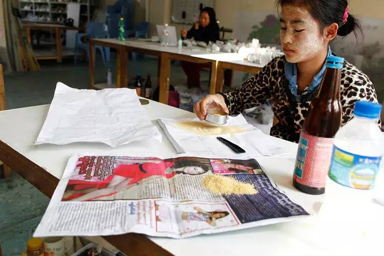 一些宝石粉末撒在缅文报纸上。缅甸盛产红蓝宝石,尤其是曼德勒省的抹谷(mogok)地区更享誉世界。当地人把小的不好利用的各种颜色的宝石分类做成宝石画,独具特色。不过,对于中国市场来说,它尚不知名。
