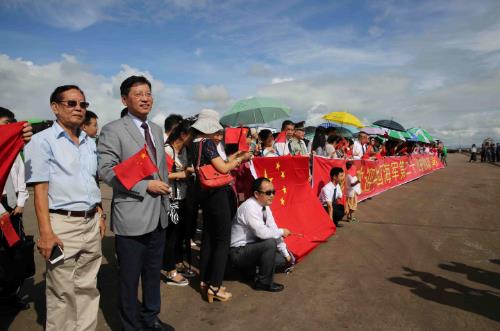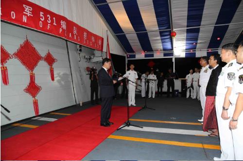 10月2日,中国海军护航编队在湘潭舰上举行了甲板招待会。洪亮大使、缅甸海军参谋长穆昂少将、仰光省首席部长漂敏登、中国海军护航编队指挥员王红理大校,以及各国驻缅使馆武官和中国海军官兵近150人参加了招待会。