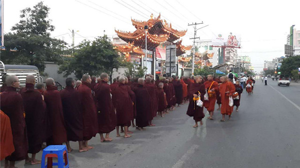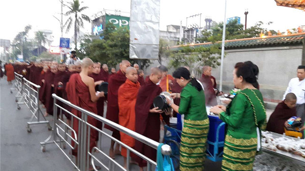 10月16日即缅历德丁局月盈日,是缅甸传统佳节吉祥日。凌晨5:50,天边露出了‘鱼肚白’,曼德勒汉人街云南会馆非常‘中式’的大门前,又在唱响‘缅式’传统宗教仪式的音乐。这样一个吉祥的大日子里,传来了吉祥的声音,这是今年斋戒三月的最后一个斋日!云南会馆理监事的布施会,便选在这一天。