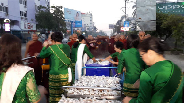 云南会馆副监事长蒋先生,一边准备向‘鹏鹏’僧侣献上捐款,一边感慨万分地说:“我们云南会馆这样的布施活动,十分有意义!这是真正‘融入主流’的实际行动!这样的行动可以消除当地缅甸人对华人的许多疑虑,让他们知道我们华人德祐,与他们同宗教同文化,可以减轻反华情绪!而且由云南会馆来主导组织,更加体现我们华人团结的凝聚力!”
