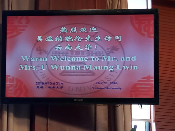 应云南大学缅甸研究院邀请,缅甸联邦共和国前外交部长吴温纳貌伦Wunna Maung Lwin阁下及夫人于2016年10月24日访问云南大学并作了题为“我的外交经验与我眼中的中缅关系”的演讲。演讲于当日14时在云南大学呈贡校区法学院二楼报告厅举行,吸引了来自云南大学、云南师范大学、云南民族大学的师生、缅甸研究爱好者以及部分企业的代表150余人参加。演讲由云南大学社会科学处处长李晨阳教授主持。