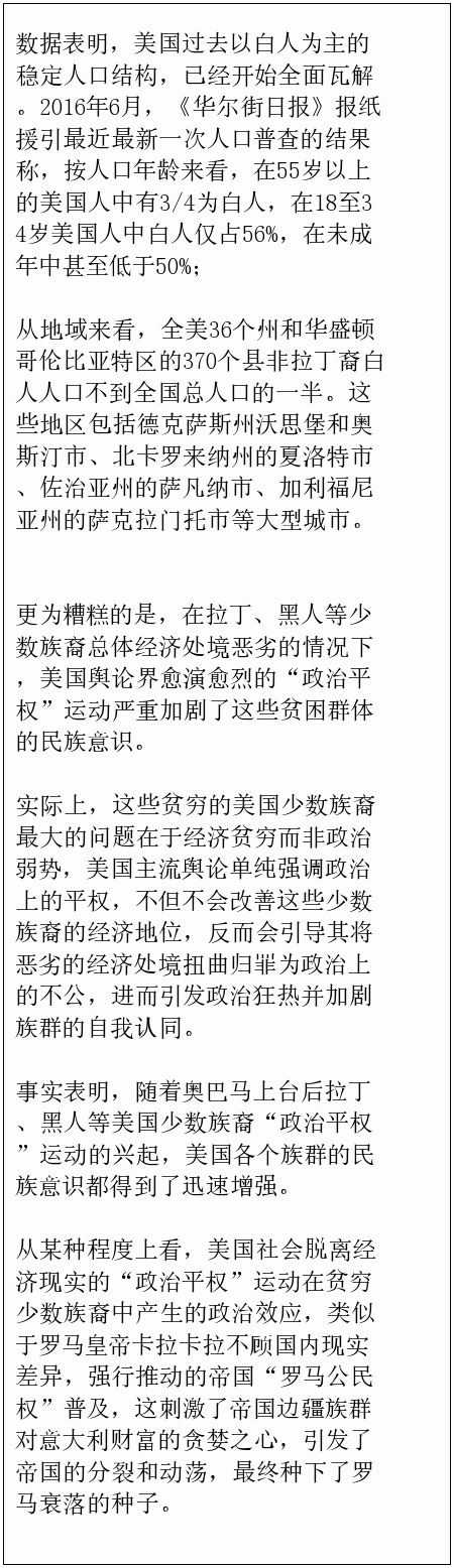 其次,美国曾经稳定的族群结构正在或者已经倾塌。