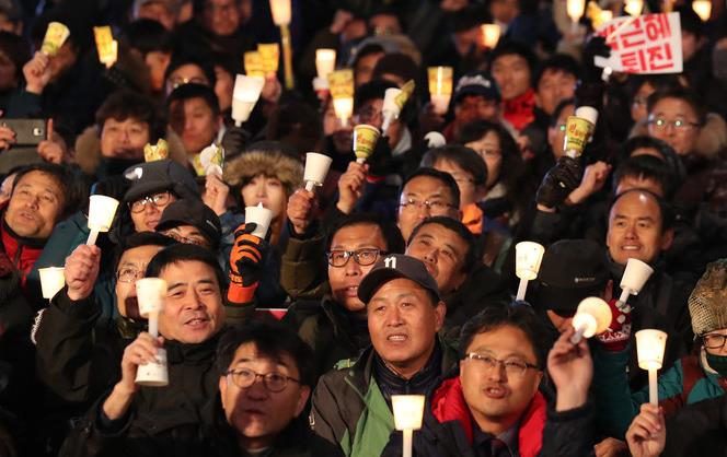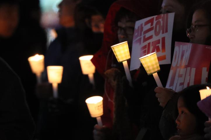 当地时间2016年11月9日,韩国首尔市民参加烛光集会敦促总统朴槿惠下台。