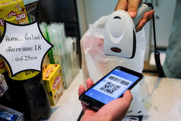 12月9日,在泰国曼谷街头一家便利店,店员扫描一名中国游客手机上的支付宝客户端条码,直接收取货款。