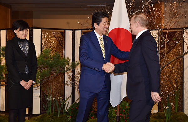 12月15日,在日本山口县长门市大谷山庄本馆,日本首相安倍晋三(左二)及夫人安倍昭惠(左一)迎接俄罗斯总统普京。新华社发