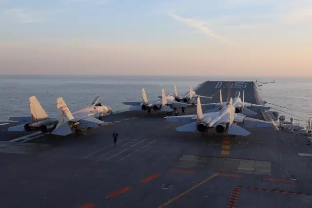随后,担负对海突击任务的多架歼—15战机,挂载新型空对舰导弹也从辽宁舰依次起飞,空中集合出航,实施横向战术展开。数分钟后,编队发现目标,在海上编队指挥所的指挥下,歼—15战机飞行员分别发射空空导弹和空舰导弹,成功将目标摧毁。