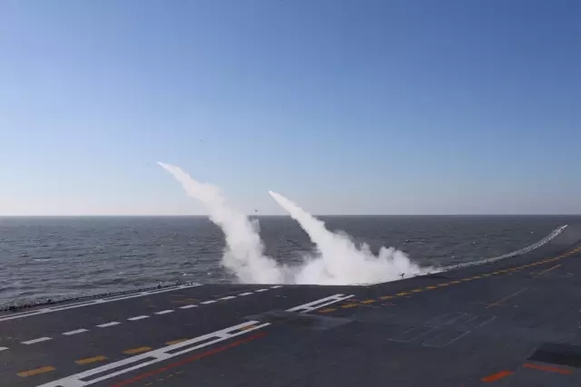 ▲辽宁舰发射舰空导弹,拦截来袭目标