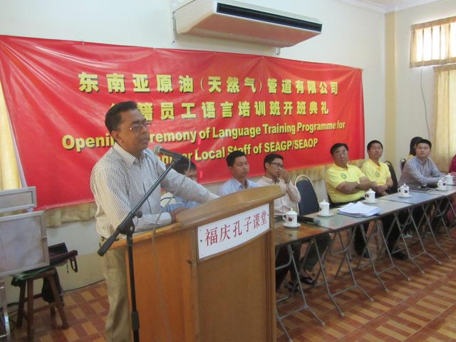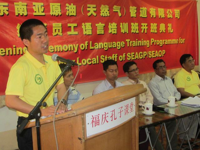 典礼上首先由东南亚原油(天然气)管道有限公司人事处陈炜先生致开幕词。陈先生表示此介绍培训班的主要目的,此次培训是东南亚原油(天然气)管道有限公司为了提高员工们的水平及减少语言沟通的不便,对缅籍员工进行的第三次语言培训。通过前两次培训,员工们的语言水平已有所提高,希望员工们把握此次培训的机会,学好英文与中文,并于将来的道路上能实际发挥有效的作用。