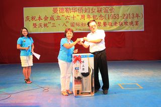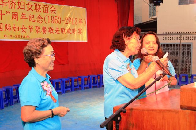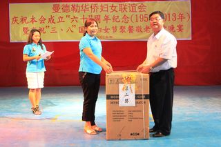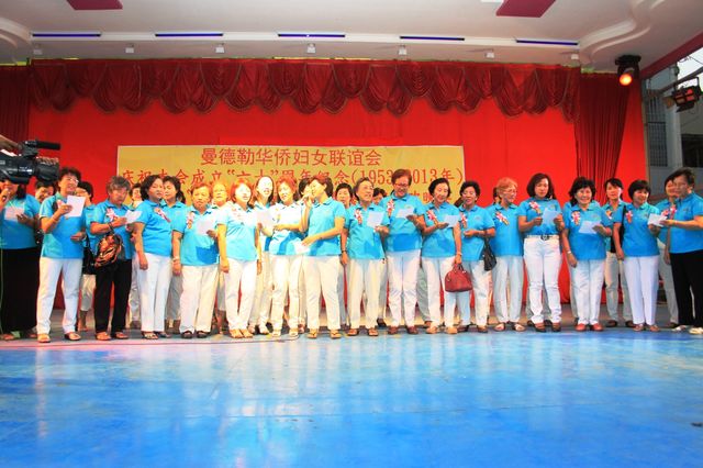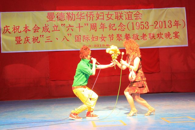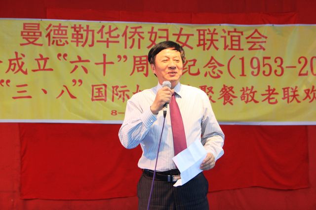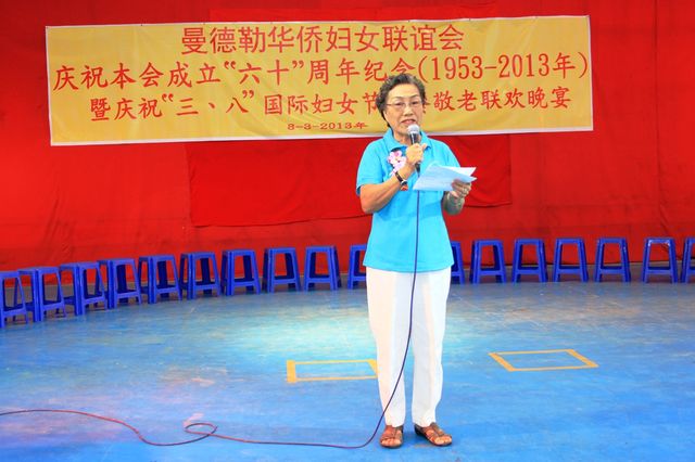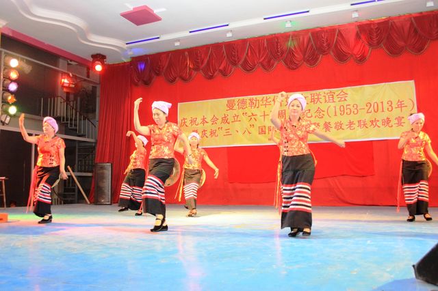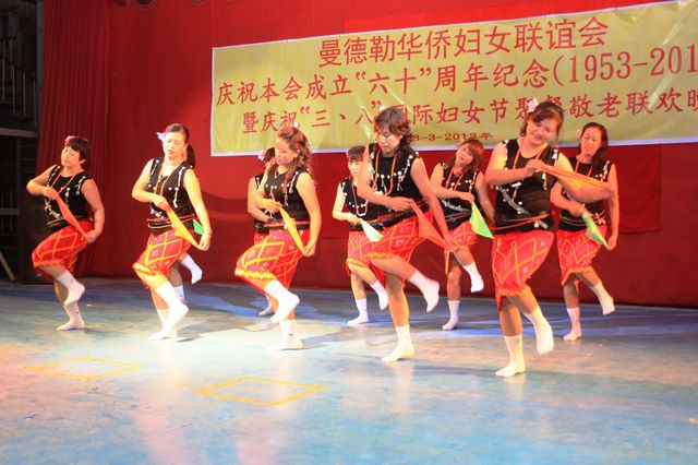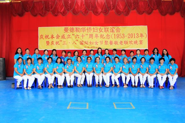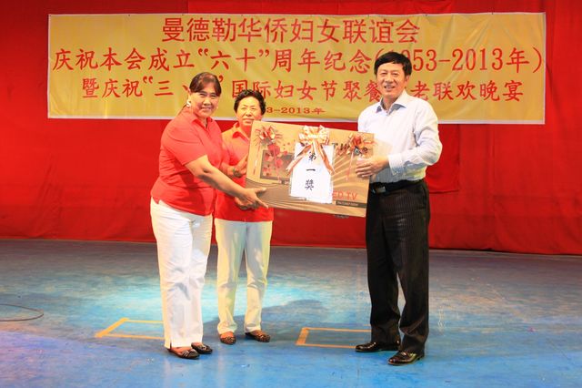 2013年3月8日,值此三八妇女节来临之际,曼德勒华侨妇女联谊会于曼德勒云南会馆举行成立60周年纪念暨庆祝“三八”国际妇女节聚餐敬老联欢晚会。中华人民共和国住曼德勒总领事馆郁伯仁总领事及全体领事、曼德勒云南同乡会、福建同乡会、广东同乡会、多省同乡会的领导们,华侨中小学校校友会的代表、福庆孔子课堂校领导、果敢妇女组、福建妇女慈善会、金多堰妇女慈善会共1000余人应邀出席。