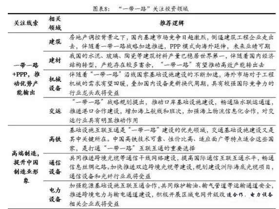 当前无论是从国内环境,还是从国际格局来看,“一带一路”都处在加速推进期,伴随着未来“一带一路”战略进一步走向纵深,将会有更多国家和地区加入到与中国的经贸合作中来,对于逐步走出国门的中国企业而言,也意味着未来存在更多机遇。5月份即将在北京召开的“一带一路”国际合作高峰论坛,无疑会进一步提升“一带一路”的市场关注度。我们认为三条投资线索值得关注:一条线索是PPP模式与“一带一路”相结合带来优势产能的输出,主要涉及建筑,建材,机械等行业。其次,是以高铁、通信、电力设备等高端制造业为代表的优势产业的对外推广。第三,是关注西部地区大规模基础设施建设,走向新一轮前沿。