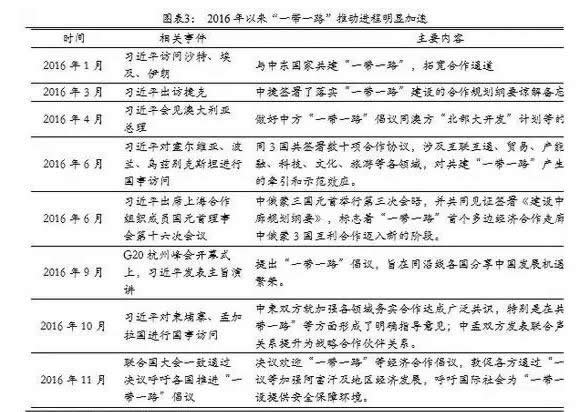 “一带一路”建设步入快车道。2013年9月和10月,习近平总书记出访中亚和东南亚国家期间,首次提出“一带一路”战略。11月,十八届三中全会《决定》提出,推进“一带一路”建设,形成全方位开放新格局,标志着“一带一路”战略正式提出。在随后的两年时间里,“一带一路”相关战略规划陆续出台,各相关职能机构先后建立,“一带一路”逐渐走向纵深。而从2016年下半年开始“一带一路”建设全面提速,“一带一路”步入快车道。