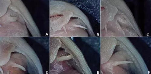 ▲异齿鰋属(Oreoglanis)物种口角须后端对比。A.景东异齿鰋 O. jingdongensis; B. 无斑异齿鰋 O. immaculatus; C. 显斑异齿鰋 O. insignis; D.红岗异齿鰋 O. hponkanensis; E. 大鳍异齿鰋 O. macropterus; F. 穗缘异齿鰋 O. setiger.