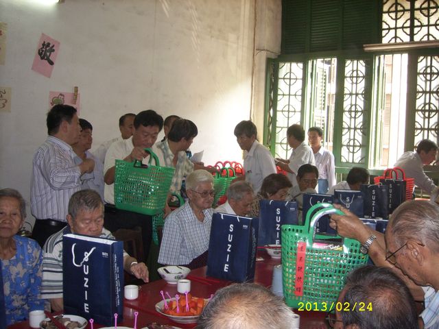 永远荣誉理事长 家清锦,理事长 家鼎汉,名誉理事长 家国川、家国财,副理事长 家名庆、家康成、家建福、家金财、家兴忠、副总务 家振庆,福利 家叔明,副福利 家友财 和交际 家振群等 十三位宗贤共同筹资了幸运奬红包赠送给莅临敬老会的寿星们。敬老会在温馨感人 、欢笑祝福中圆满结束。愿 敬老爱老 的中华传统美德能够一代一代相传下去。