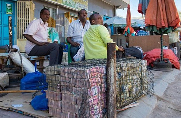 在首都哈尔格萨,钞票成捆的出售,政府也默许这样的行为,这也成就为了唯一的钞票市场。这些钞票用绳子扎起来,堆放在街边,也不用担心别抢,因为太不值钱。