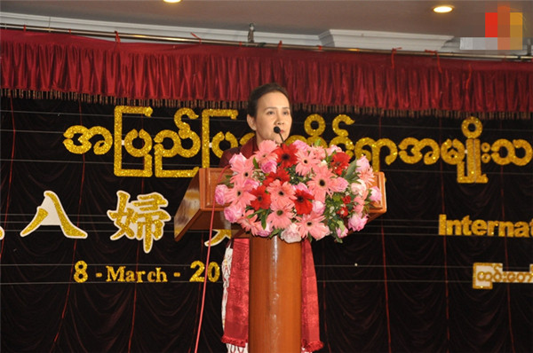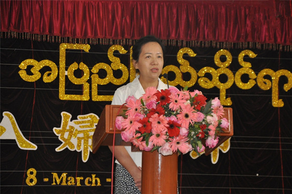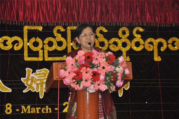 在欢庆会上,首先由曼德勒省省长夫人 Dr. Yu Yu May 致开幕词。省长夫人表示今日举办的“国际三八妇女节”活动是一个不分宗教、不分种族,大家共同共祝的吉庆日子。节日名称虽为“妇女节”,但目睹台下众多男同胞代表也积极参与,向妇女同胞送上最真挚的祝福,其乐融融,非常欣慰。在男同胞在提倡提高女性的社会地位,关注与承认女性存在的价值的同时,女同胞还需要懂得承担起应有的责任。就如缅甸国家顾问昂山素季女士前日与女企业家见面时所言,“我们妇女同胞们不仅要工作,而且在国家和谐方面、国家社会经济方面都也要积极参与。主要由于受教育程度、知识浅陋、不懂得保护自己、易被蒙骗等影响,缅甸妇女地位不高。所以我们要以新的观念、新的想法面对国家各方面的建设工作,要需要拿出改革的勇气和耐力来做出推动妇女经济社会发展的2030规划。”